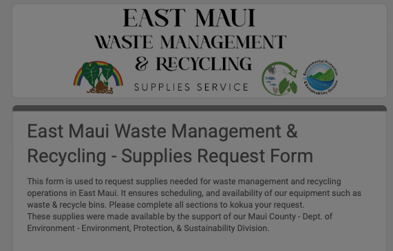 This form is used to request supplies needed for waste management and recycling operations in East Maui. It ensures scheduling, and availability of our equipment such as waste & recycle bins. Please complete all sections to kokua your request.